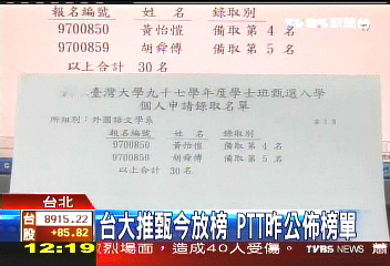 中国台湾网4月11日消息 台湾大学新生录取榜单发生外泄事件!台湾大学原定今天(11日)上午9点公布录取新生榜单,不过从昨天上午开始,完整的榜单就已经贴在岛内一家知名网站上。台湾大学方面今天表示,是因为昨天进行上网测试,网友通过搜索引擎找到,并且拦截复制。对此,有很多学生家长质疑学校的信息安全,他们表示,学生缴了那么多报名费,学校竟连学生基本权益都保护不了,提供这么粗糙的服务质量让人不能忍受。