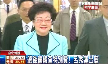 中国台湾网4月14日消息 据台湾TVBS电视台报道,台湾地区副领导人吕秀莲因为“特别费案”遭起诉,今天法院重新审理,这也是该案在台湾地区领导人选举后第一次开庭。