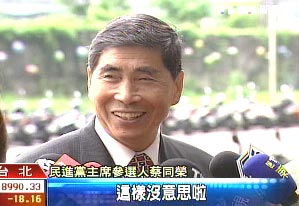 中国台湾网4月24日消息 据台湾TVBS电视台报道,民进党主席选举,本来今天早上安排三位候选人蔡英文、蔡同荣和辜宽敏坐下来协调结果,3人中唯一亲自出席的蔡同荣到了党中央,才知道代理主席谢长廷根本不会出席,蔡同荣频频抱怨党中央“不够意思”。