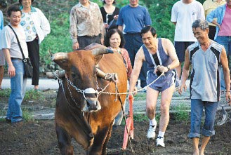马英九(前右二)曾在下乡时向农夫许支主(前右)学犁田,马希望各“部会首长”以后也要下乡长住。台湾《联合报》资料照片 范凌嘉摄