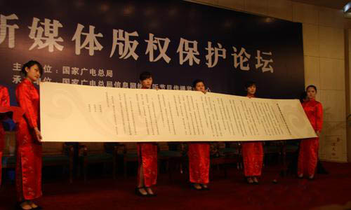 与会的百余家行业单位在论坛上共同签署了《奥运新媒体版权保护北京宣言》,郑重向社会作出承诺:以新媒体转播本届奥运赛事,需提前以合法途径获得相关授权和许可;自觉抵制侵权盗版行为,采取切实有效的措施加强奥运新媒体版权保护;遵守国家有关法律法规,认真贯彻落实奥林匹克知识产权保护规定,切实执行《互联网视听节目服务管理规定》;高度尊重北京2008年奥运会权利人以及持权转播商机构的权益,共同探索业务合作模式,在合法授权范围内传播奥运赛事;共同把奥运版权保护作为奥运会传播业务的重要组成部分;自觉接受政府主管部门对奥运新媒体版权保护的监管,积极支持有关机构开展的打击侵权盗版行动;遵守本宣言的各项约定,接受社会各界监督。”