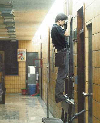 台“金援弊案”事涉重大,台检方侦办动作不断,也严守侦察不公开,让记者采访困难度大增。昨天凌晨台检方传讯张强生后饬回,一名记者透过气窗,想要了解张强生动向。台湾《联合报》记者陈柏亨摄