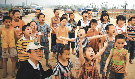 台湾慈济志工昨天在四川金山镇带着失去亲人的孩童唱歌,希望藉由歌声,让孩子们忘却地震带来失去亲人的创痛。(图片来源:台湾《联合报》)