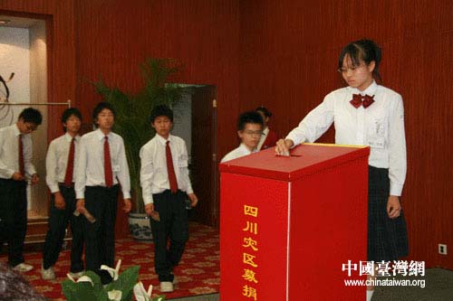据悉,该修学旅行团58名同学大多数是台胞子女,他们从俭求学,但心系四川地震灾区。捐赠仪式上,所有同学集体为四川震灾遇难同胞默哀一分钟,然后逐个把自己的一份爱心投入捐款箱中。