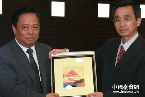 全国台联会长梁国扬出席捐款仪式,并和日本神户中华同文学校互换礼物。(摄影:钟宝华)
