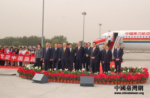 中国国民党大陆访问团一行,27日下午抵达北京首都机场。中台办主任陈云林及北京市委副书记王安顺前往迎接。图为欢迎仪式现场。中国台湾网记者田云鹏摄