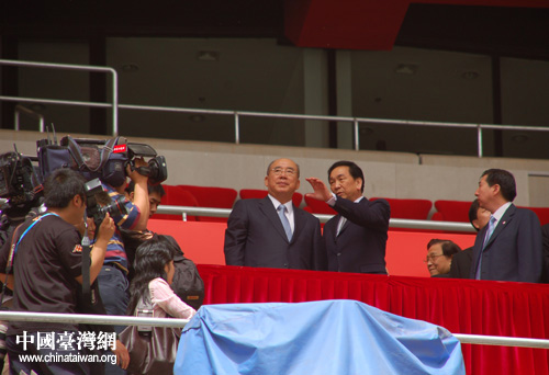 吴伯雄一行先是在观礼台上环视了体育场内的全貌,而后缓步通过观众通道走到等候在现场的记者面前,与记者亲切互动。