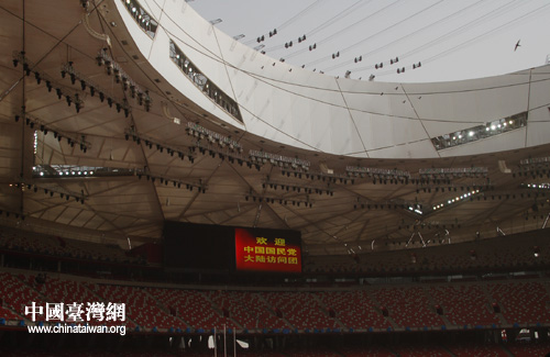 在吴伯雄一行到来之前,体育场观众席上方的大屏幕就早早地打出了“欢迎中国国民党大陆访问团”的醒目标语,热切期待着这位来自宝岛的客人。
