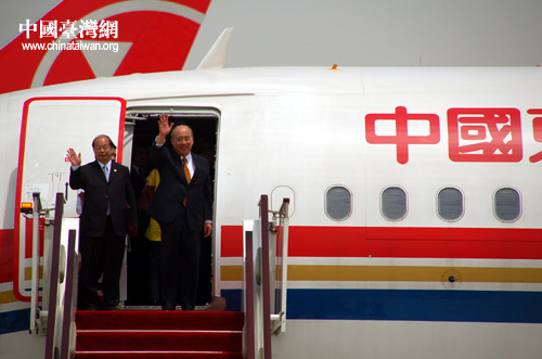 中国国民党主席吴伯雄在机舱口挥手向送行人员告别。(摄影:中国台湾网 田云鹏)