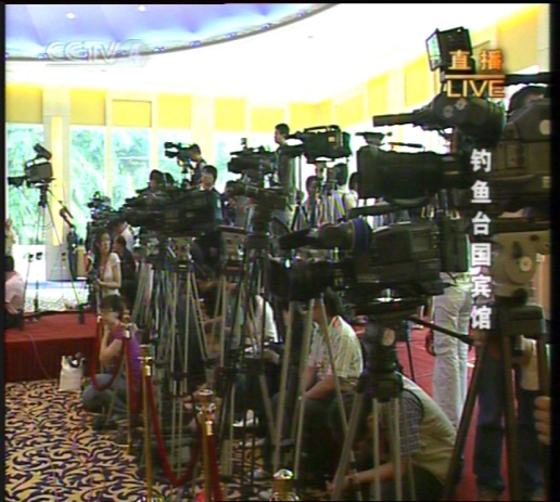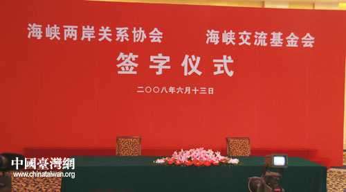 签署协议仪式现场仍然为昨天陈云林与江丙坤会谈的钓鱼台国宾馆5号楼。现场已经摆起签署协议文本所用的桌案。 (李艳波)