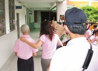 遭母亲理成大光头的六年级女生,昨天到校参加毕业典礼,父母在场为了她的监护权争吵,校方通知警察、义工妈妈保护她离校。台湾《联合报》记者吴佩玲摄