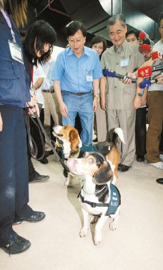 台当局“行政院长”刘兆玄(右二)昨天巡视松山机场,图为刘兆玄现场询问检疫犬的情形。图片来源:联合报