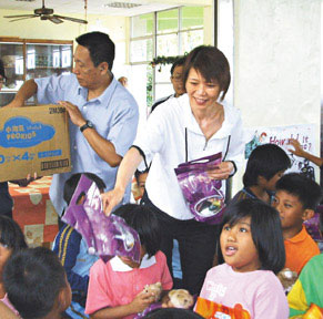 周美青向小朋友发放小熊玩具及饼干。来源:台湾《联合报》