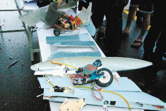 据台湾《联合晚报》报道,警消调查表示,撞上28楼的初步证实是遥控飙风战机,机翼宽度达2米,撞击上大楼面河景玻璃后,直接掉落入环河路42号28楼仅约20平米套房内的客厅,造成环河路路面都是碎玻璃和机翼残骸。