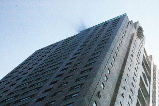 遭遥控飞机撞上的天阔28楼冒出阵阵浓烟。台湾《联合晚报》记者张佑齐摄