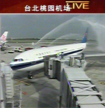中国台湾网7月4日消息 据中央电视台报道,今天上午从广州起飞的包机航班8点05分许抵达台北桃园机场后,台湾方面准备了盛大的欢迎仪式。为了帮大陆观光首发团“洗尘”,台湾方面效仿“新船入港”迎接方式,包机飞抵机场后,用消防车在停机坪对飞机进行“喷水欢迎式”。(李杰)