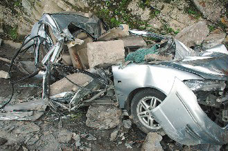台风灾害过后,台湾南横公路上无情的巨石将路过轿车压扁,车上血迹班,令人触目惊心。台湾《联合晚报》记者罗绍平摄