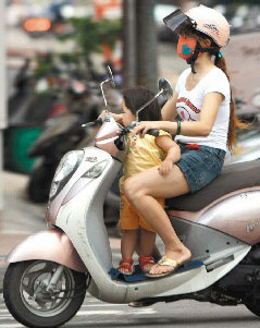 台湾家长骑着摩托车接送小朋友时,往往会让小朋友暴露在交通危险中。台湾《联合晚报》图
