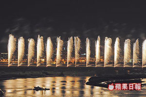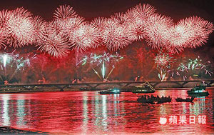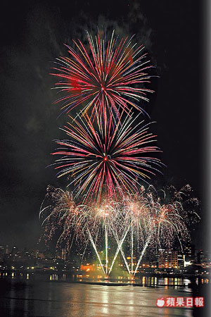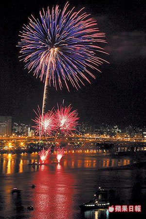 据台湾媒体报道,昨晚8时30分淡水河畔先以电影《泰坦尼克号》配乐开场,连接台北县市的忠孝桥随即喷出800米烟火瀑布。4艘平台船接着从河面上发射七彩花朵、爱心、游龙、狮子头等高空烟火图案,其中包括号称历来最大的10英寸高空烟火,射程可离地300米,开花直径200米,另搭配多款低空烟火。