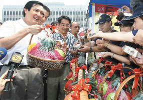 台农业部门举办活动,马英九(左)在农产品摊位也掏腰包买水果,鼓励参展的农民。台湾《联合晚报》图