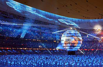 北京奥运开幕典礼表演节目展现“同一个世界,同一个梦想”的主题。台湾《中国时报》图