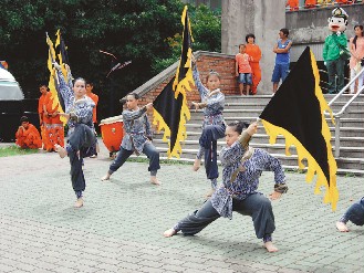 台湾新竹县“义民节”将于8月16日热闹登场,新竹客家舞蹈团昨天演出黑旗舞“义民爷”,预告精彩活动。图片来源:台湾《联合报》。