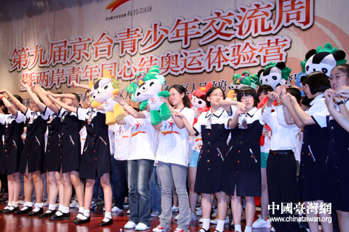 中国台湾网8月15日北京消息 今天上午,“相约2008——第九届京台青少年交流周暨两岸青年同心结奥运体验营”在北京四中开幕。来自台湾中山女子高级中学、台北市第一女子中学等学校的近400名师生,将与北京师生一起,以“相约2008”为主题,“奥运观赛”为主线,开展一系列同心奥运、体验奥运、感受奥运的交流活动。