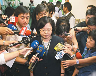 民进党昨天举行临时中常会,面对媒体追问陈水扁爆发洗钱丑闻事,民进党主席蔡英文(中)面色凝重。台湾《联合报》图