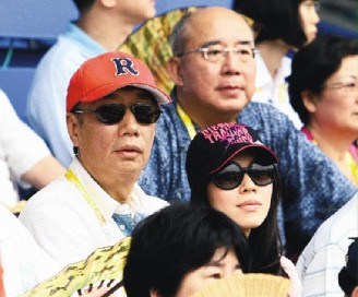 日前在北京与新婚妻子观看球赛的鸿海集团董事长郭台铭(左),传出可能出任海基会董事。