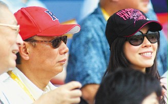 郭台铭(左)与妻子曾馨莹(右)热情赶场观看奥运赛事。