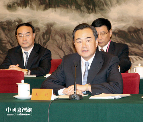 2008年台商座谈会28日上午在北京人民大会堂举行。国务院副总理王岐山和国务院20多个主要部门负责人及60多位台湾工商界人士、大陆台商代表参加座谈。图为中共中央台办、国务院台办主任王毅在主持座谈。(中国台湾网 田云鹏 摄)