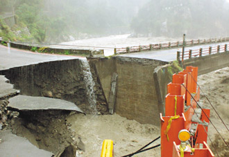 台风“森拉克”挟带的暴雨使台中县大甲溪暴涨,溪水将中横公路32公里处笃铭桥一端的路基掏空,变成“断头桥”,台“公路总局”已紧急封闭附近道路。(图片来源:台湾“联合新闻网”)