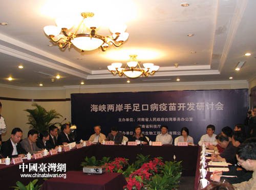 中国台湾网9月25日消息 由河南省台办、河南省科技厅联合主办的“海峡两岸手足口病疫苗开发研讨会”今天在河南郑州召开,来自海峡两岸的20多位手足口病疫苗开发领域专家学者参加了研讨会。河南省台办主任宋丽萍、省科技厅副厅长马世民等和相关部门负责人出席了会议。