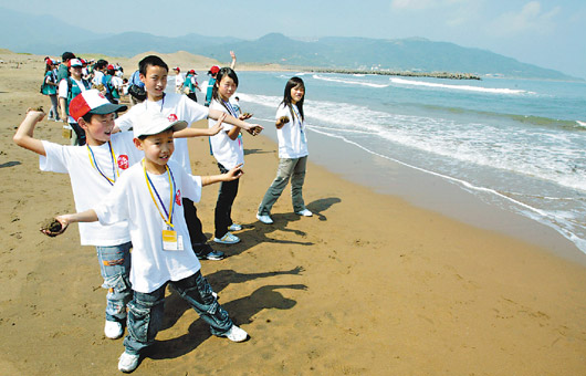 由于台风刚过,海滩满布垃圾、漂流木,主办单位为避免从未看过海的小朋友失望,特别让他们走到海边,但是不可以脱鞋。小朋友们弯腰玩水,也有人堆起沙堆或是抓起海沙猛力丢向大海。潮水涌上时,人人急着往回奔,来不及的人鞋子打湿,但依然玩得很高兴。在四川地震中救出多名同学的高一生王祖全还用宝特瓶装了半瓶海沙,他说,家乡不靠海,要把海沙带回家当纪念。