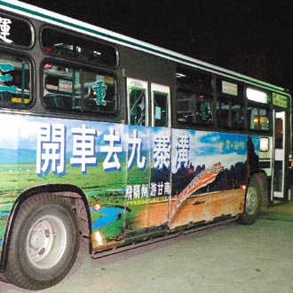 台北县三重客运公交车的车体广告,出现用介绍四川九寨沟的旅游信息。台湾《联合报》图
