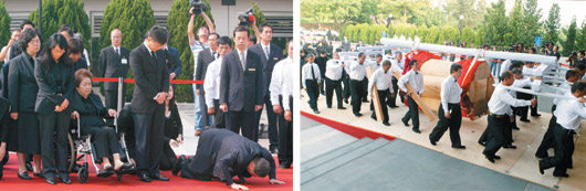 王永庆遗体昨天入殓,家属分列两旁迎棺;长子王文洋行跪拜礼。
