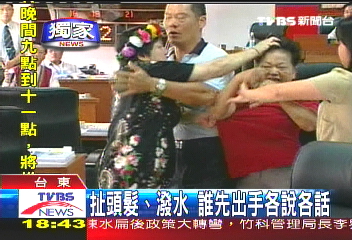 中国台湾网10月29日消息 据台湾媒体报道,台湾台东市今天召开市民代表大会,一名女代表余梅香发言不满市公所的人事任用,遭到另一名女代表赖秀星抗议。2人开始只是言语挑衅,最后不但互扯头发,还叫骂泼水,旁人频频劝阻,但是无法阻止2人冲突。