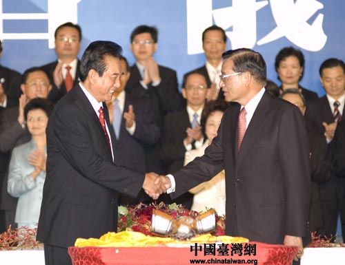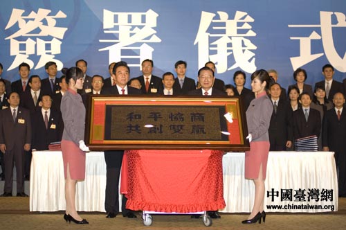 中国台湾网11月4日台北消息 海协会和海基会今天下午14时正式进行海运、空运、通邮和食品安全相关协议签署仪式,协议签署后,海协会会长陈云林赠与海基会董事长江丙坤一尊代表握手形象的雕塑,江丙坤则赠与陈云林写有“和平协商共创双赢”8个大字的匾额。(田云鹏)