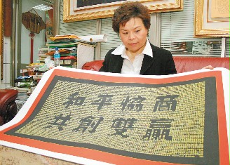 中国台湾网11月5日消息 二次“陈江会”签署协议的会场上,海基会送给海协会会长陈云林的一幅镶有6千个小金字的“和平协商,共创双赢”金笔镂空书法令人印象深刻,据台媒报道,这是台湾书法家詹秀蓉花了了七天七夜完成的作品。