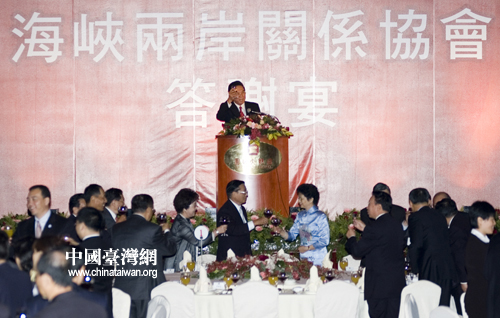 海峡两岸关系协会6日晚在台北市圆山饭店举行答谢晚宴,感谢海基会董事长及海基会主要工作人员。陈云林致辞后宾主共同举杯庆祝。田云鹏 摄