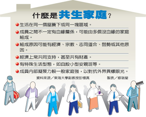 中国台湾网11月20日消息 综合台媒报道,越来越多的“共生家庭”正在台湾社会出现,他们可能是一群志同道合的好友同住,也可能因理念、宗教关系共食共耕,彼此没有血缘关系,但他们说“我们都是一家人”。曾研究这类家庭的台湾东海大学社工系副教授彭怀真表示,随着社会形态改变,另类共生家庭增多是可预期的,“血缘可能不再是唯一的缘。”