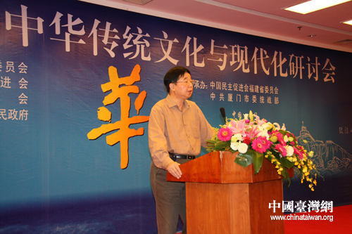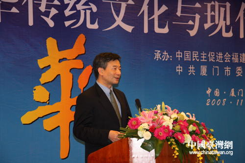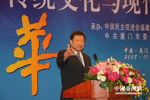 国民党中常委、中华两岸文化经济协会理事长廖万隆在闭幕式上致辞。他以国民党中央委员会的名义和厦门市荣誉市民的身份,向与会的两岸专家学者表示敬意和欢迎。他从300年前祖先从漳州到台湾讨生活、300年后自己从台湾来厦门开创事业的历史谈起,激动地表示,中华民族几千年流传下来的文化伦理是中华民族实现现代化的精神动力。传统文化要和现代化结合起来,使两岸共享经济繁荣成果,社会族群和谐。