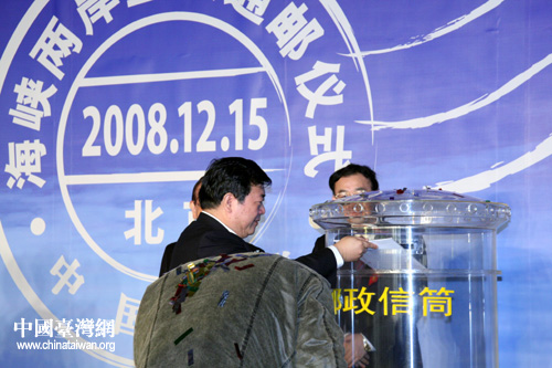 国务院台湾事务办公室副主任孙亚夫等头投交两岸直接通邮首批信函。中国台湾网记者 钟宝华 摄