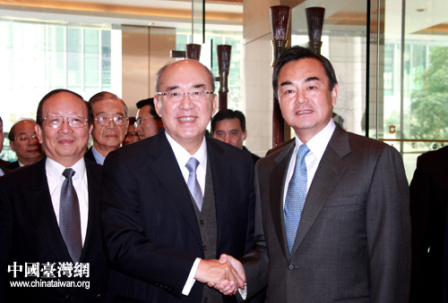 中共中央台办主任王毅迎接中国国民党主席吴伯雄一行。中国台湾网 李徽 摄