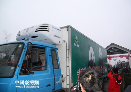 12月23日,四川雅安碧峰峡基地举行大熊猫赴台启动仪式。运载“团团”、“圆圆”的运输车从碧峰峡基地启程驶往成都双流机场。中国台湾网 田云鹏 摄