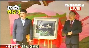 赠台大熊猫“团团”、“圆圆”照片及基因祖谱赠送仪式今天在台北举行,图左为台北市长郝龙斌。来源:台湾TVBS电视台