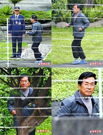 陈水扁进入花圃后,先深深地吸了一口清新自由空气,简单热身后,就绕着花圃圆形水泥地,逆时针慢跑起来。为了避免发生意外,三名管理人员眼睛没离开过他,不敢有丝毫放松,其中一人还全程拿着DV录像。