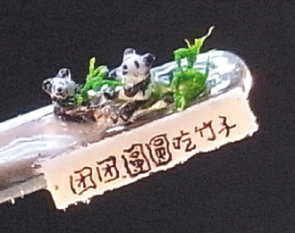 据台媒报道,从事微雕已经29年的台湾微雕家陈逢显,继上月用树脂创作出世界最小的大熊猫后,又花费20个工作日以头发创作出世界最小的大熊猫,作品取名“团团圆圆吃竹子”。作品中“团团”“圆圆”表情快乐的吃着台湾产的竹子,栩栩如生,令人叹为观止。陈逢显表示,这个作品象征台湾土产的竹子也能让“团团”“圆圆”享用后,身体健康又聪明可爱,和台湾民众打成一片。