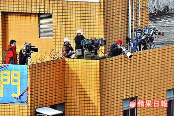 为了捕捉陈水扁放风画面,台北看守所旁边建筑高处聚集了大批记者。来源:台湾《苹果日报》