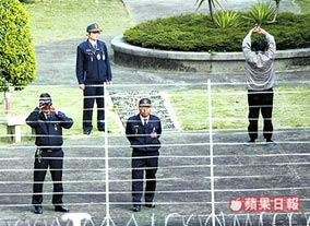 陈水扁昨天放风时,故意背对媒体做体操,看守所管理员也对媒体进行监看。来源:台湾《苹果日报》